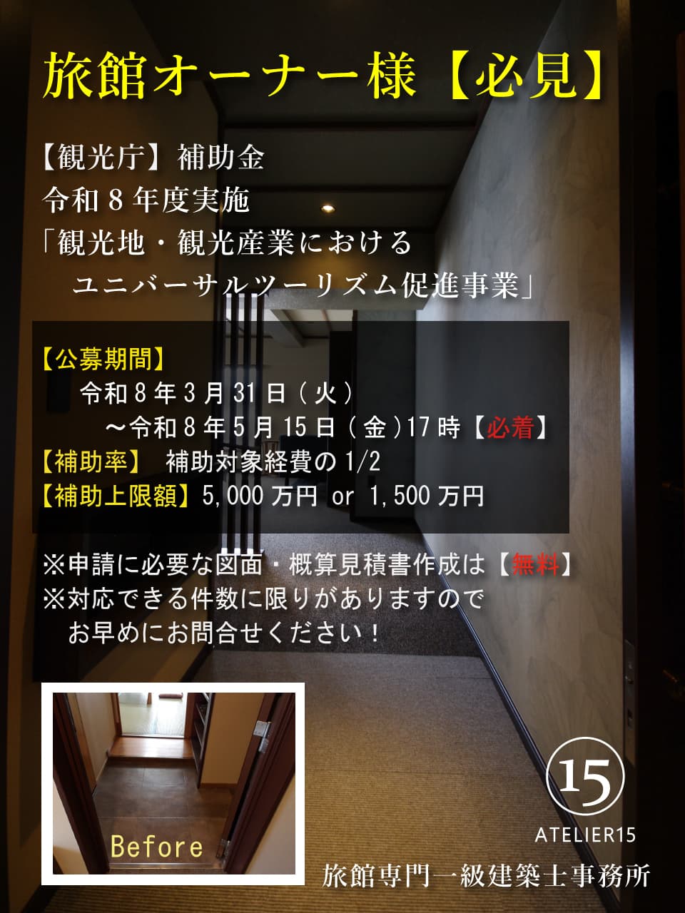 そんな旅館リノベーションに対するオーナー様の『お困り』『悩み』『不安』を“旅館リノベーション”の知識と経験が豊富な一級建築士が《解消・解決》致します!